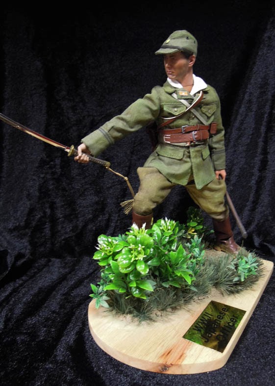 Here is my latest work. The Imperial Japanese Army officer. In March of 1944 the 100,000 troops of Japanese 15th Army launched a determined offensive against the British position inside the India/ Burmese border. The head took from 3R products of Toshiro Mifune "Commander in chief of the combined fleet" item no-JP610, the uniform and gear were from item no- 021173 Japanese Army officer by BBI collectable. The boot from New Line Miniature products. As usual, entire uniform are weathered that the base is custom. 新作的兵偶作品, 日本帝國陸軍軍官, 背景是1944年10萬名日本陸軍第15軍於印緬邊界發起進擊英軍的戰事. 頭雕取自於3R的聯合艦隊的三船敏郎, 裝備與制服則取自於BBI , 這套已經是絕版品, 軍官靴則是NLM. 整體有舊化處裡過! 地台自製!